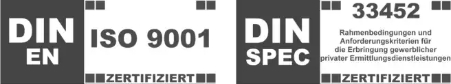 Als Mitglied von mehreren Berufsverbänden werden alle unsere Detektive regelmäßig weitergebildet und arbeiten nach aktuellsten ethischen und rechtlichen Ermittlungsstandards. Das bestätigt auch unsere DIN ISO 9001 und die DIN SPEC 33452 Zertifizierung.